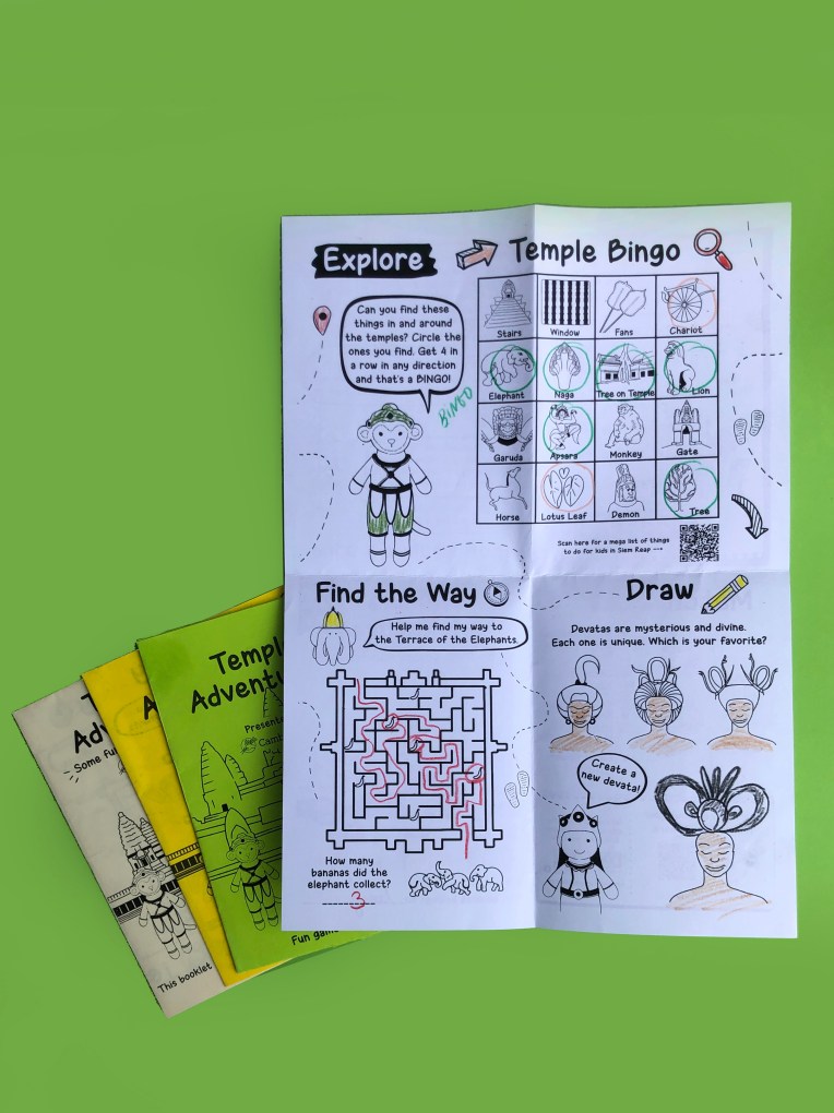 Your visit of Angkor Wat temples will be turn in a playful adventure! Follow the iconic characters of Cambodian creation brand and learn more about the Khmer culture and history. This flyer has been designed for the social brand to be given to every of their client as a memorable souvenir from Cambodia.