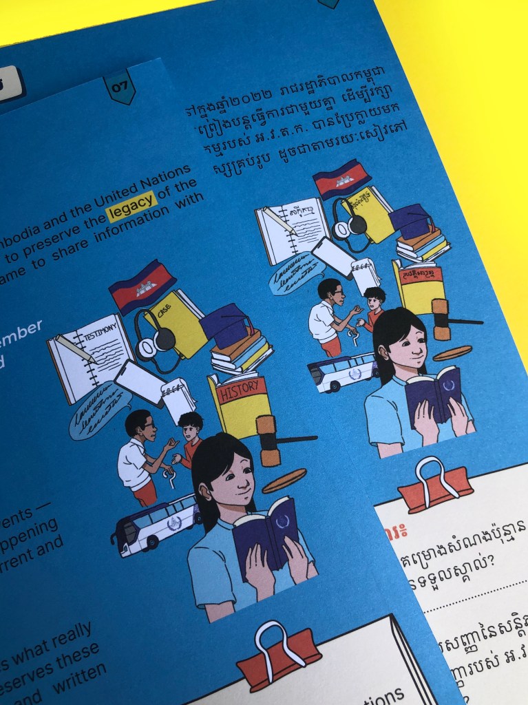 Every Cambodian child needs to understand the concept of justice and how it has been applied during the extraordinary chambers in the courts for Khmer Rouge. Our illustrated booklet, designed as a journal for children, contents a comic, a fictive judge interview, an infographic and many more elements to explain in simple words the process and results of the trials.