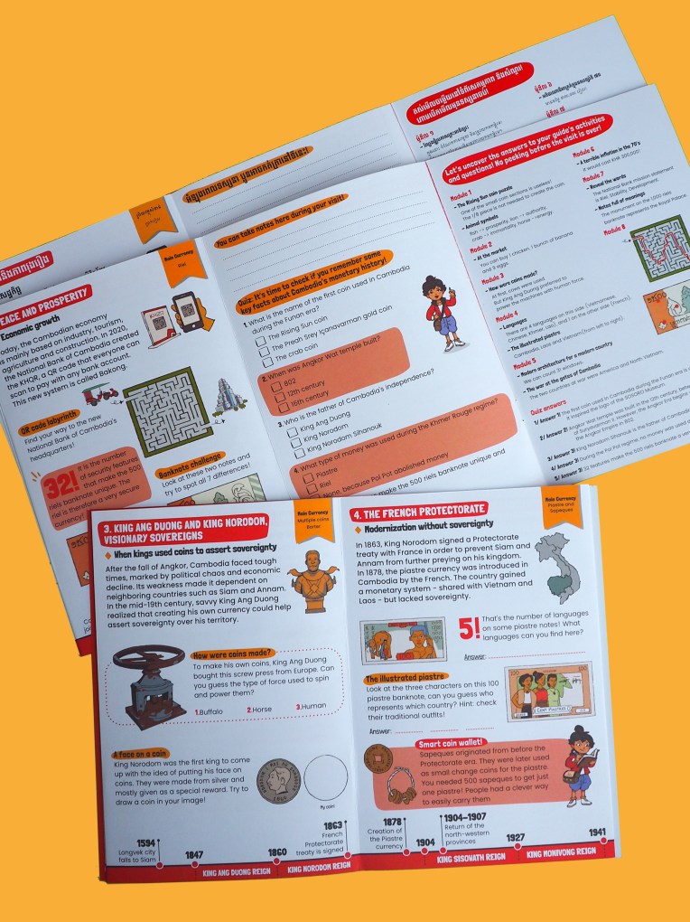 Imagine an interactive paper guide to enthusiasm children visiting the museum with their family or with their classmates! Sovann, the little history explorer, invites children in a travel in time along Cambodia money history. Page after page children will participate to fun activities and get new knowledge about the fascinating history of the kingdom.