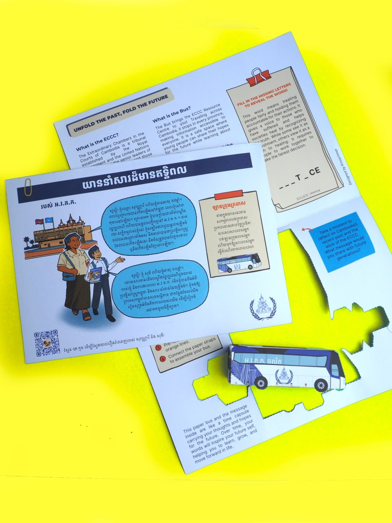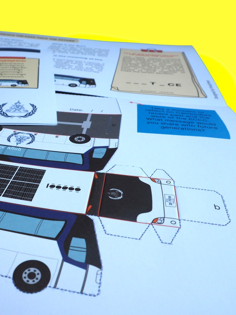 The paper bus template -ready to be made- has been designed to symbolize the ECCC mobile ressource center. Thanks to its hidden message section, it is also a vehicle for powerful message about a Cambodia in peace. A kind of time capsule of thoughts and hopes for future.